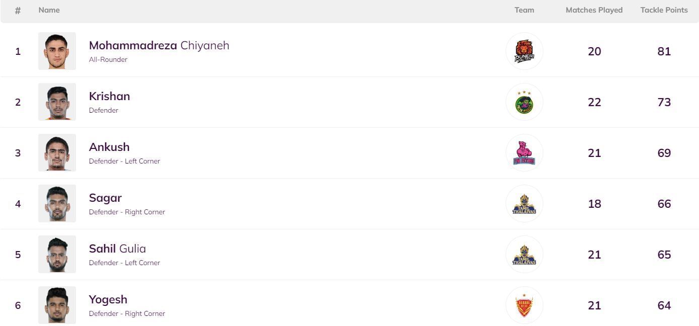 Mohammadreza Shadloui and Krishan Dhull continue to be the top two defenders of the tournment. Sagar Rathee, Sahil Gulia and Yogesh Dahiya are the other names present in the Top 6. None of the top six defenders will be in action tonight in the PKL in Haryana.