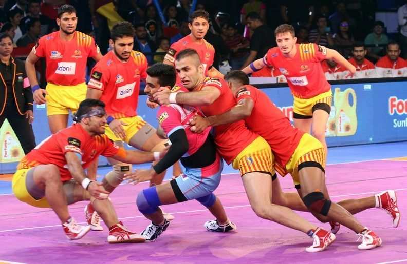Despite being another action packed game, the next match between Gujarat Fortunegiants and Jaipur Pink Panthers seemed a dull affair after the high octane clash. Both the teams looked conservative with their raiding and the best of the moments came from the defence that helped Gujarat register their third consecutive victory in their home leg.