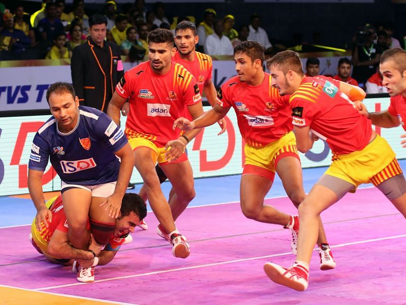 In one of the most bizarre moments ever seen in Pro Kabaddi, Dabang Delhi on a Do Or Die Raid in the second half opted to send in their left corner defender Sunil to take the raid. This despite having a regular raider in Anand Patil on the floor. It was an inexplicable move that made no sense and surely enough Sunil ended up getting rather easily tackled.