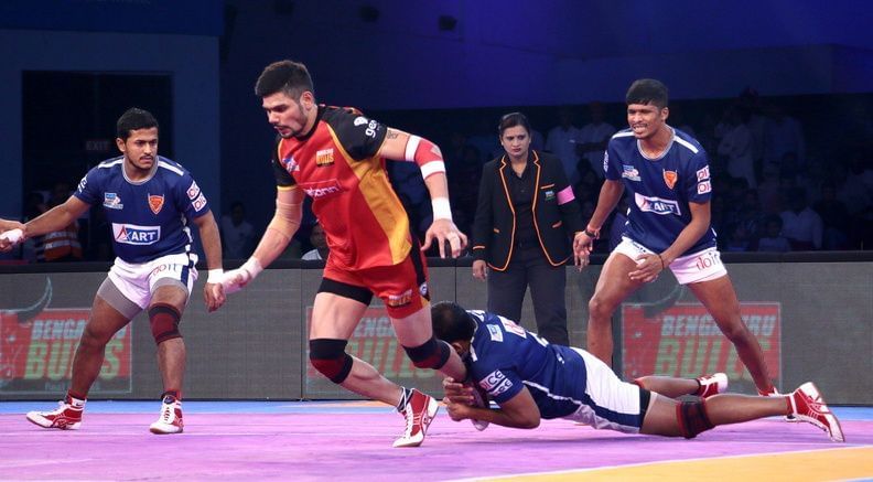 The brilliant Rohit Kumar made merry against the struggling Dabang Delhi with his vicious raids. Putting his touches and escapes to devastating effect, the Bulls captain brought about his tenth Super 10 in scintillating fashion and finished with a score of 12 from 26 raid attempts.