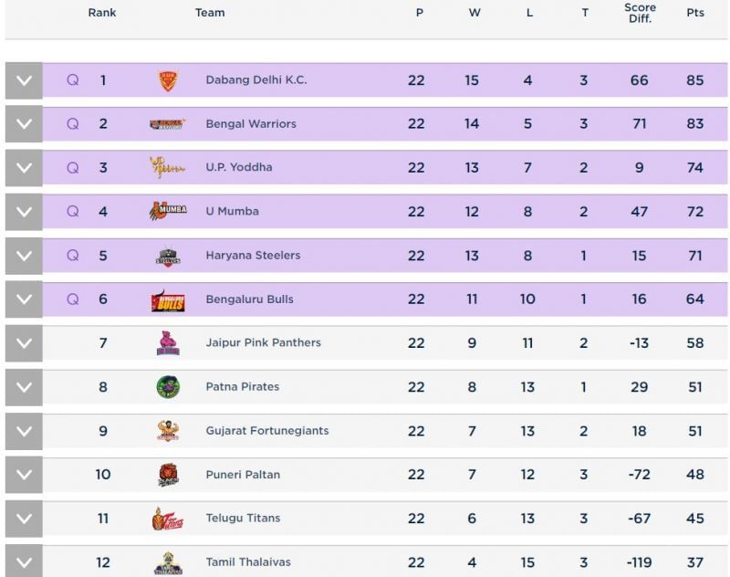 As mentioned ahead, Dabang Delhi K.C. and Bengal Warriors are the top two teams of the season and they will be joined by U.P. Yoddha, U Mumba, Haryana Steelers and Bengaluru Bulls in the playoffs. Tamil Thalaivas took the wooden spoon home with just 4 wins in 22 matches while Telugu Titans and Puneri Paltan failed to cross the 50-point mark.