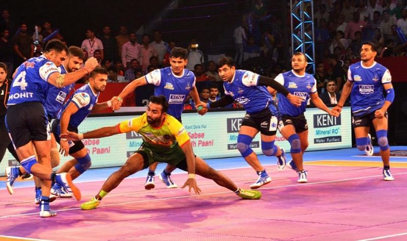 If you observe Neeraj's gameplay closely, you'll see how Neeraj doesn't execute a tackle by himself most often. But he can assist the effort made by the corner defenders. In Season 5, Neeraj assisted Surender Nada and Chillar pretty well him taking down the raiders after an attempt of an ankle hold or a dive that allowed the defenders to get successful tackle attempts.