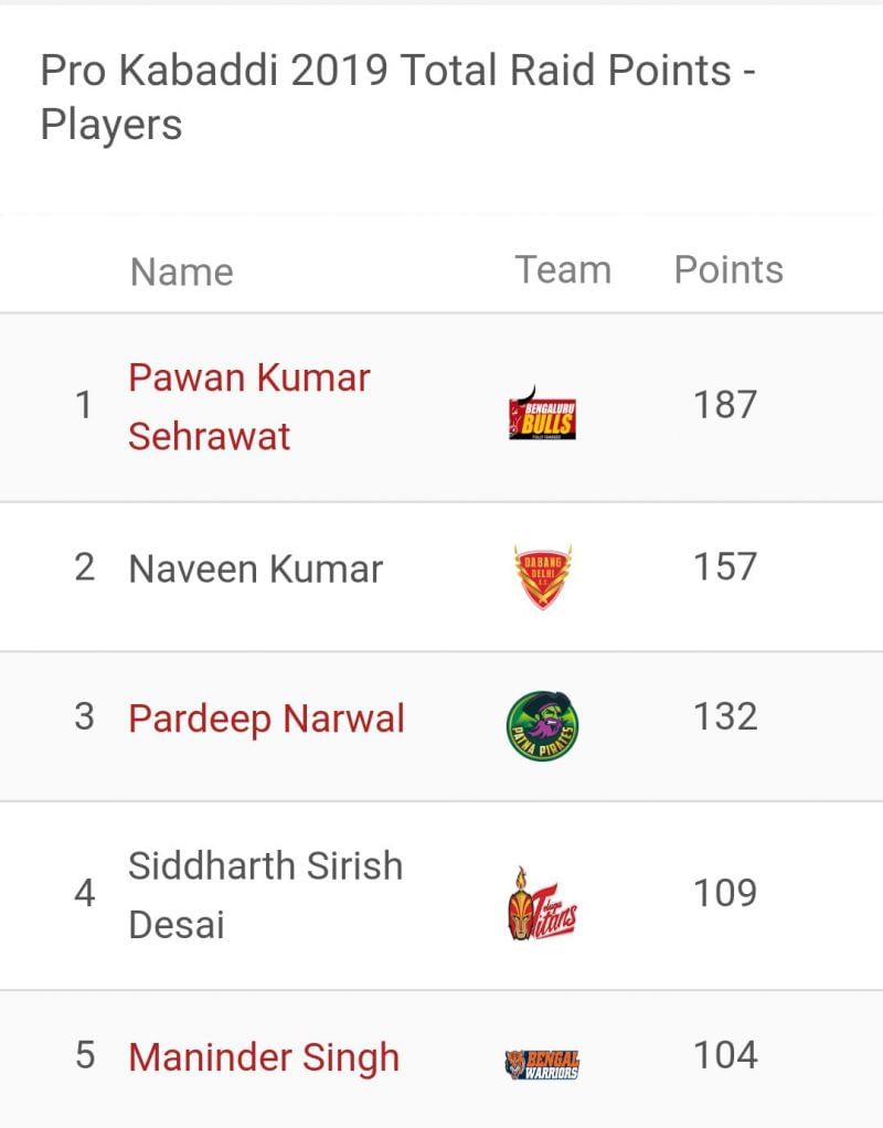 There are no changes in the top 5 of the raiders' leader-board as Pawan Sehrawat continues to be the top raider of the season. Naveen Kumar is inching closer towards him while Pardeep Narwal, Siddharth Desai and Maninder Singh are way behind the top two raiders.