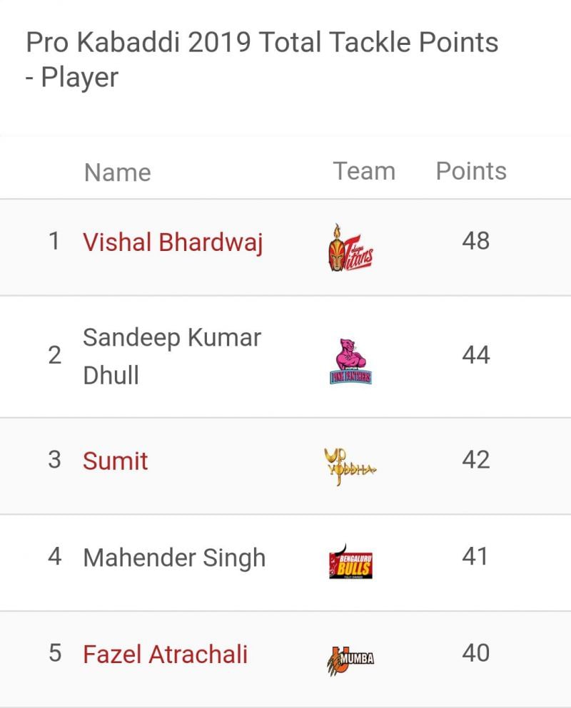 Fazel Atrachali has entered into the top 5 of the leader-board for most tackle points, as his 3 tackle points today have taken his overall tally to 40. Apart from that, there have been no changes in the top 5.