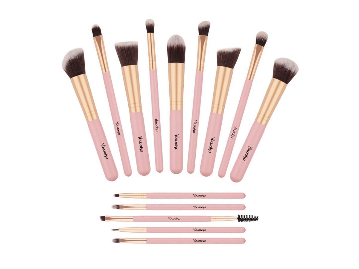 The Yuwaku Premium Kabuki Makeup Brush Set has 14 pieces in total. Five of these are basic Kabuki brushes. 9 out of these 14 are eye makeup brushes. The features of these brushes include a matte finish and a wooden handle. It has a rose gold ferrule that fits between the wooden handle and dark brown bristles.