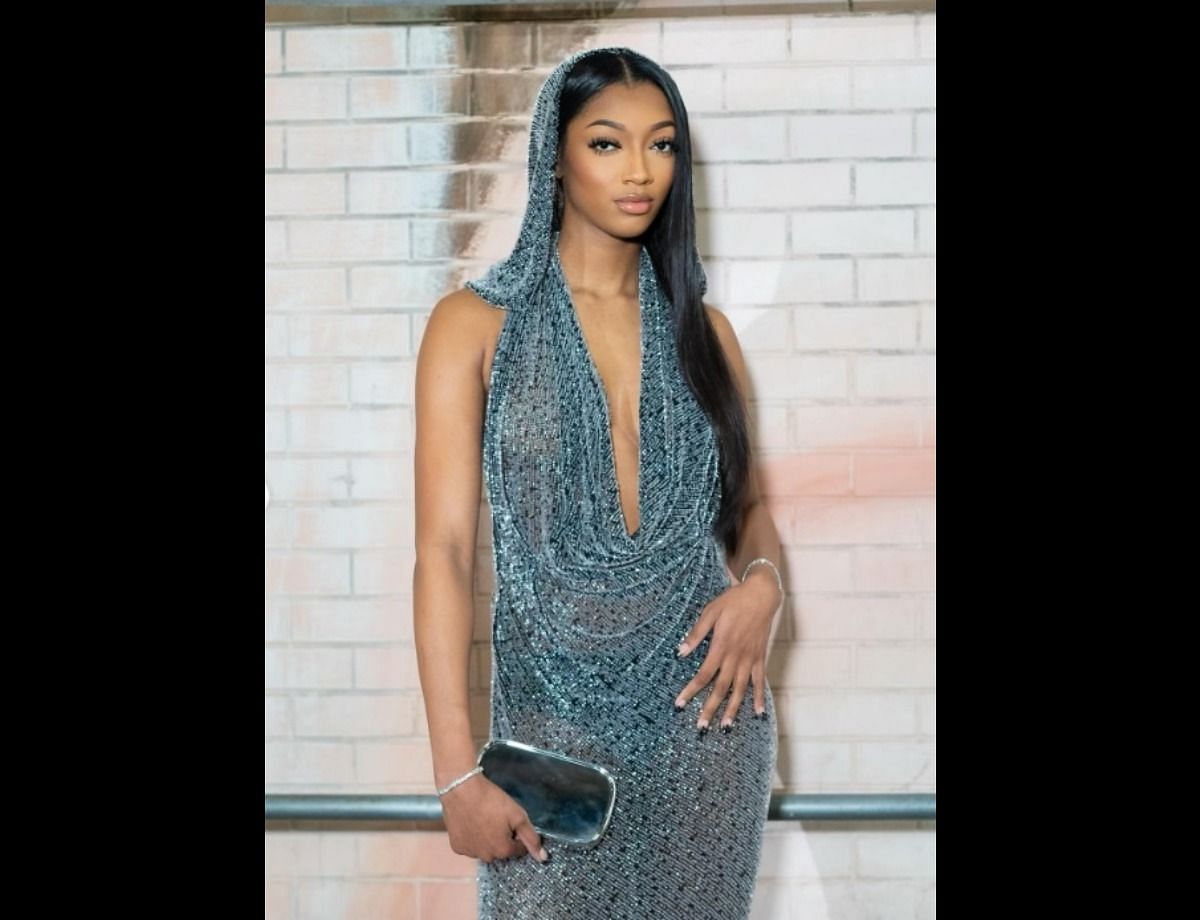 Angel Reese went with the brand's fall 2024 collection, a silver gown called the Amalia gown. The dress had a deep open back that made her silhouette look feminine. The neck of the dress had a cowl neck finished with a hoodie. The gown had a dramatic trail that made her look like a Barbie doll.