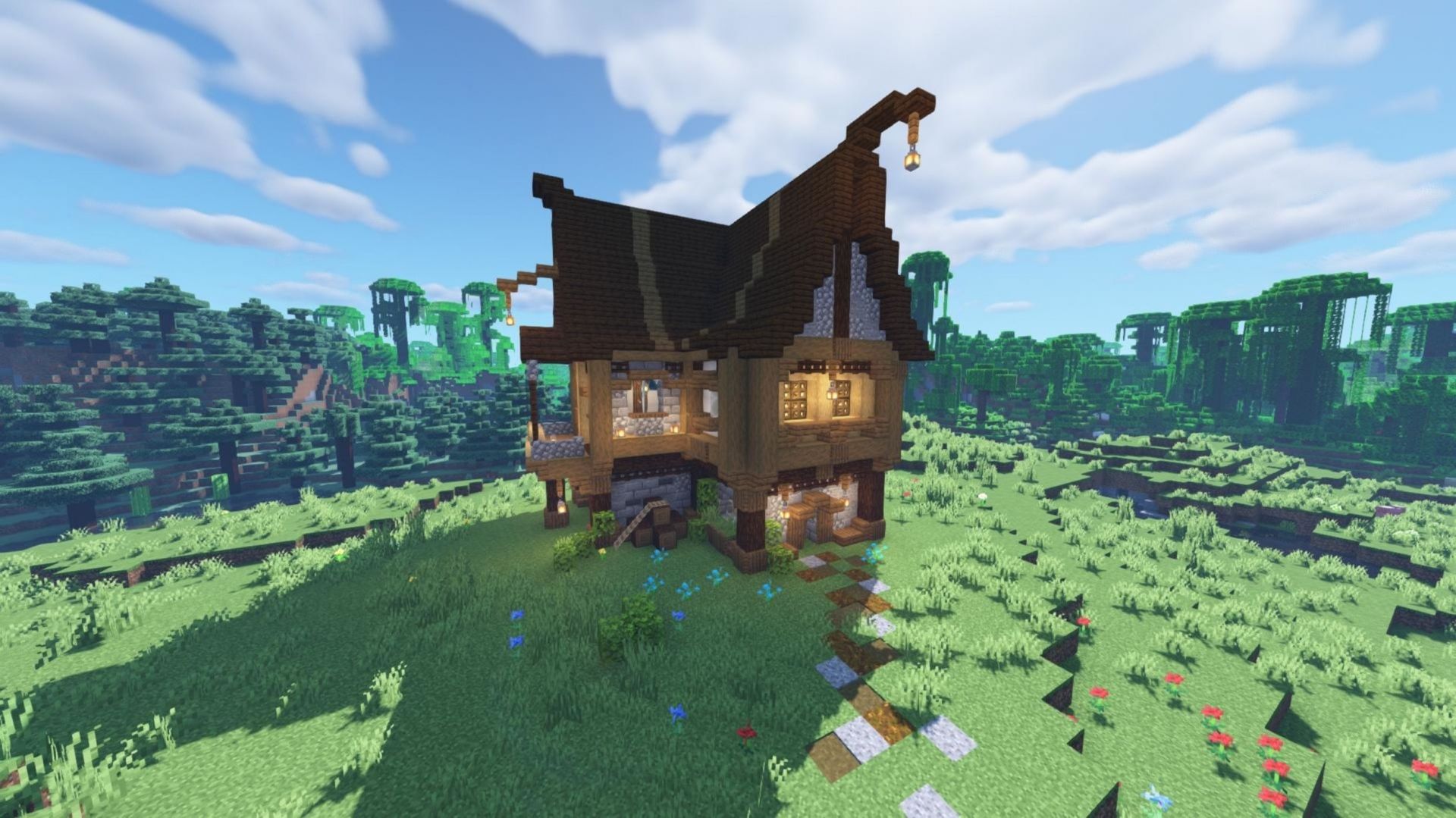 Minecraft players can craft as much as they need to in the outer courtyard before heading inside for some relaxation. Vines creeping down the walls and lanterns lighting its entrances convey a rustic (but not decrepit) atmosphere. Add in some leaf blocks and potted flowers, and this house build becomes a great combo of form and function.