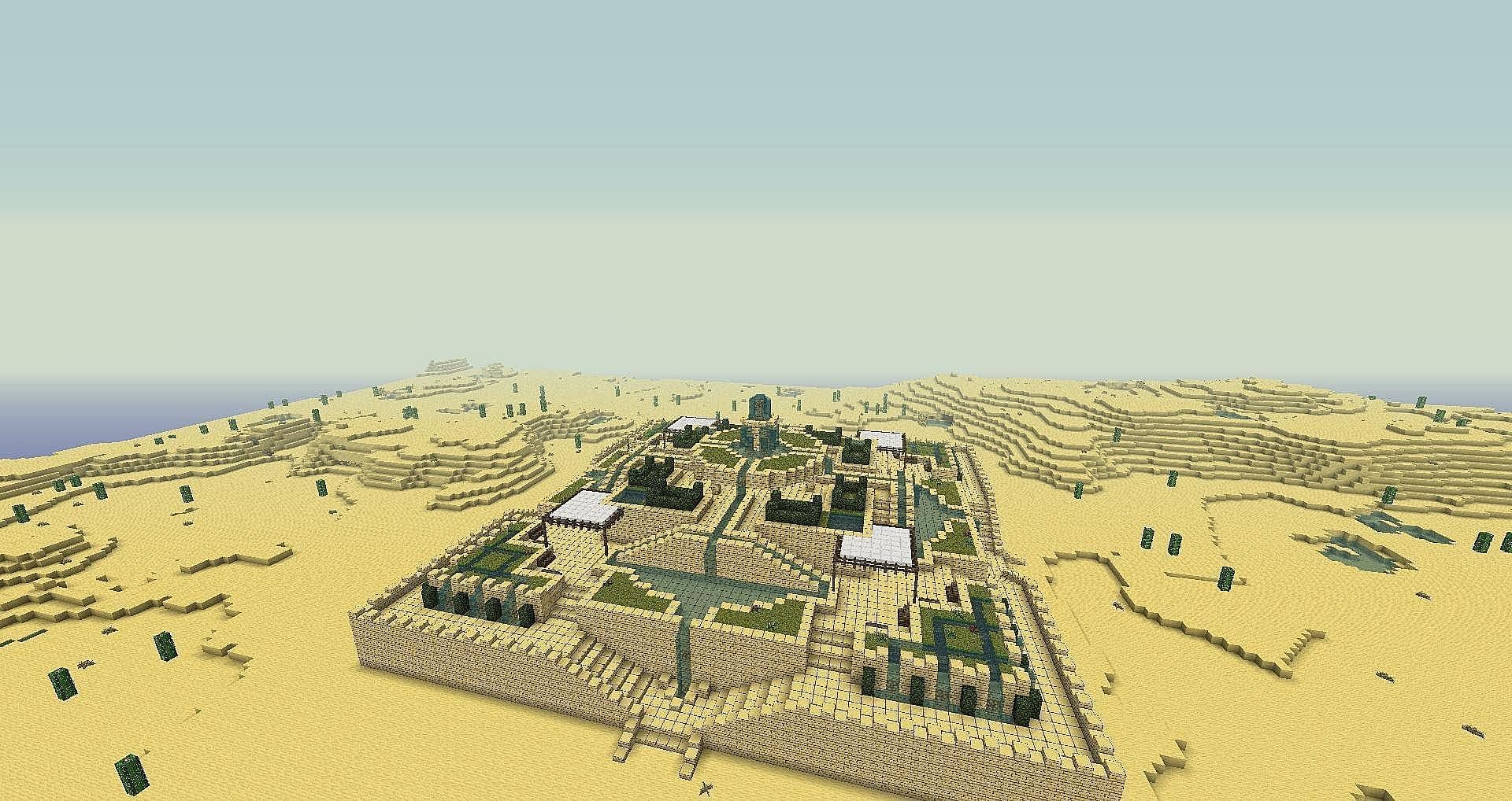 This seed spawns the player in a gigantic desert biome. Deserts are good for building cities, as they include huge chunks of flat surfaces compared to other biomes. Apart from the necessary space to build a city, this seed contains a desert temple and ravine close to spawn. Both of these places can be used to collect and mine resources for a survival build.