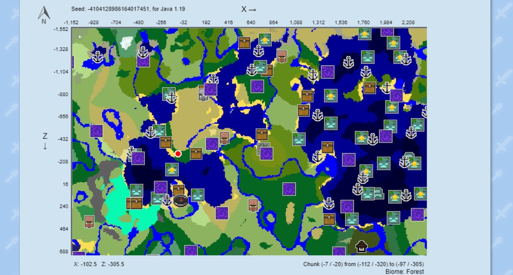 To the south, a combination of forest biomes eventually leads to a plains biome. This plains biome is host to a pillager outpost and a village.