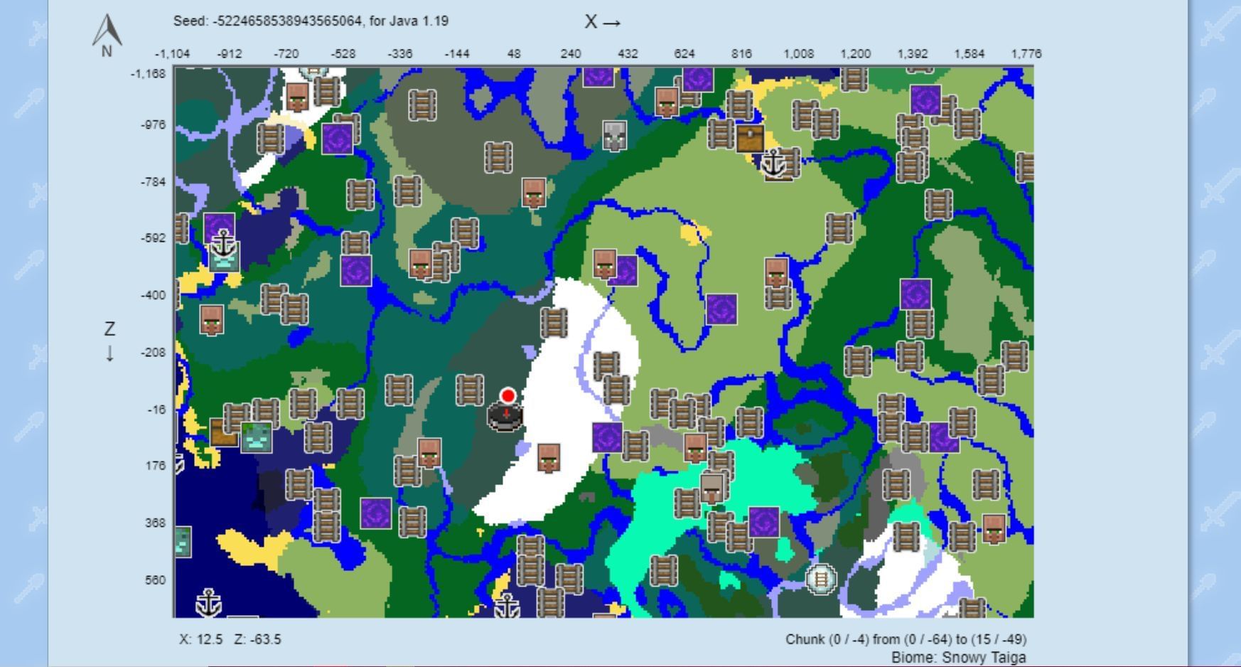 This seed spawns users inside a snowy taiga biome, with snowy and other taiga biomes surrounding them. There are a few villages scattered in every direction from spawn.