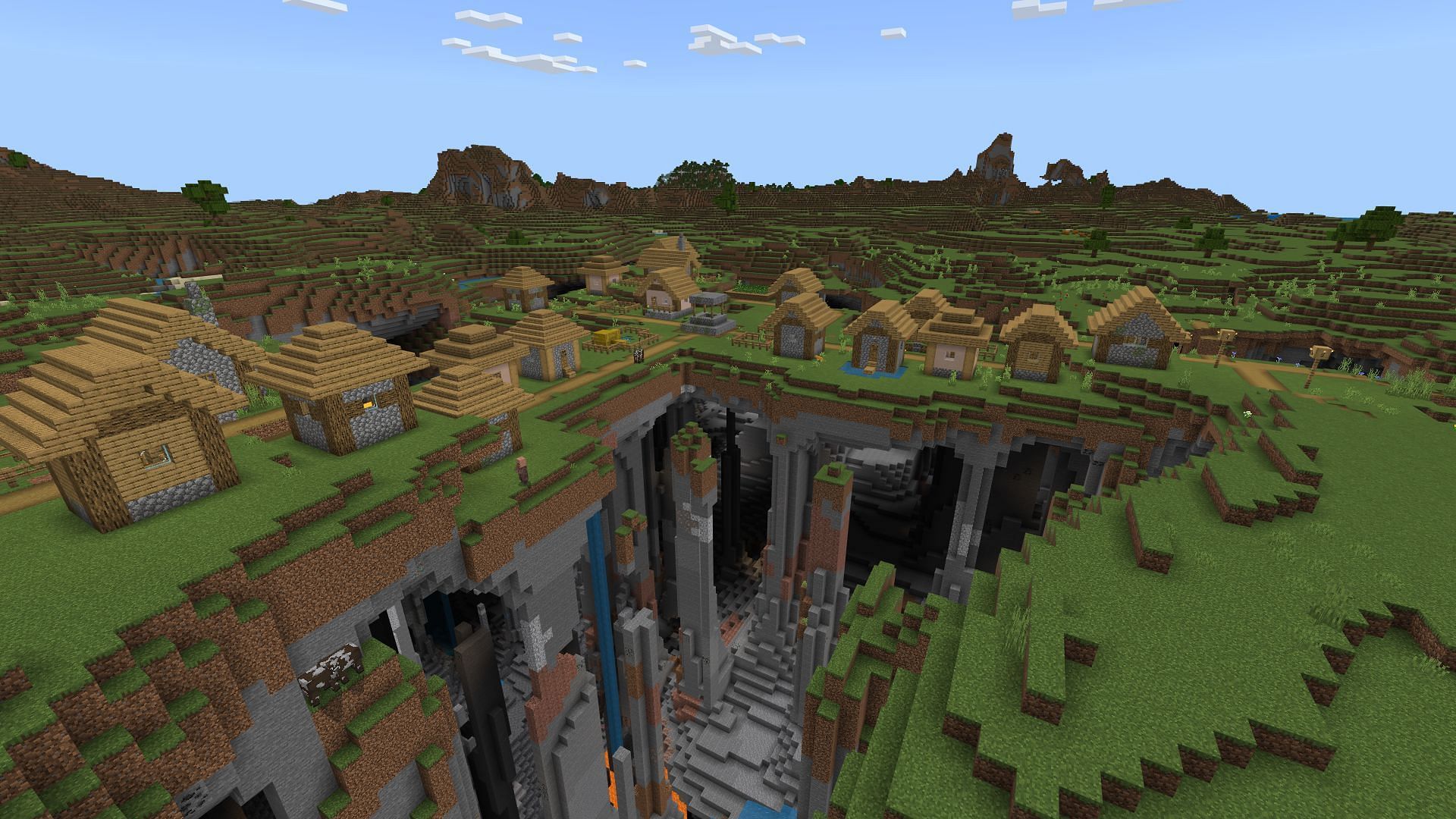 There has always been odd terrain generation in Minecraft Bedrock Edition, but after the Caves & Cliffs update in 2021, it has skyrocketed and can be found in most seeds. In this particular seed, players spawn near a village levitating over a hollow cave. This area might be a good starting place for players who enjoy living in villages and cave mining. Right below the village, you will find many ores generating in the giant cave, stretching for hundreds of blocks.