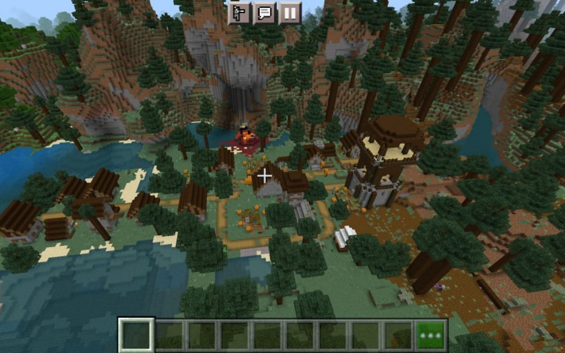 This Minecraft seed spawns players near a village that has a great view of an Outpost in the middle of a river. Near the village, players will find a huge cave opening that will lead them to an abundance of iron ore. While exploring the caves, players will also stumble upon a skeleton spawner.