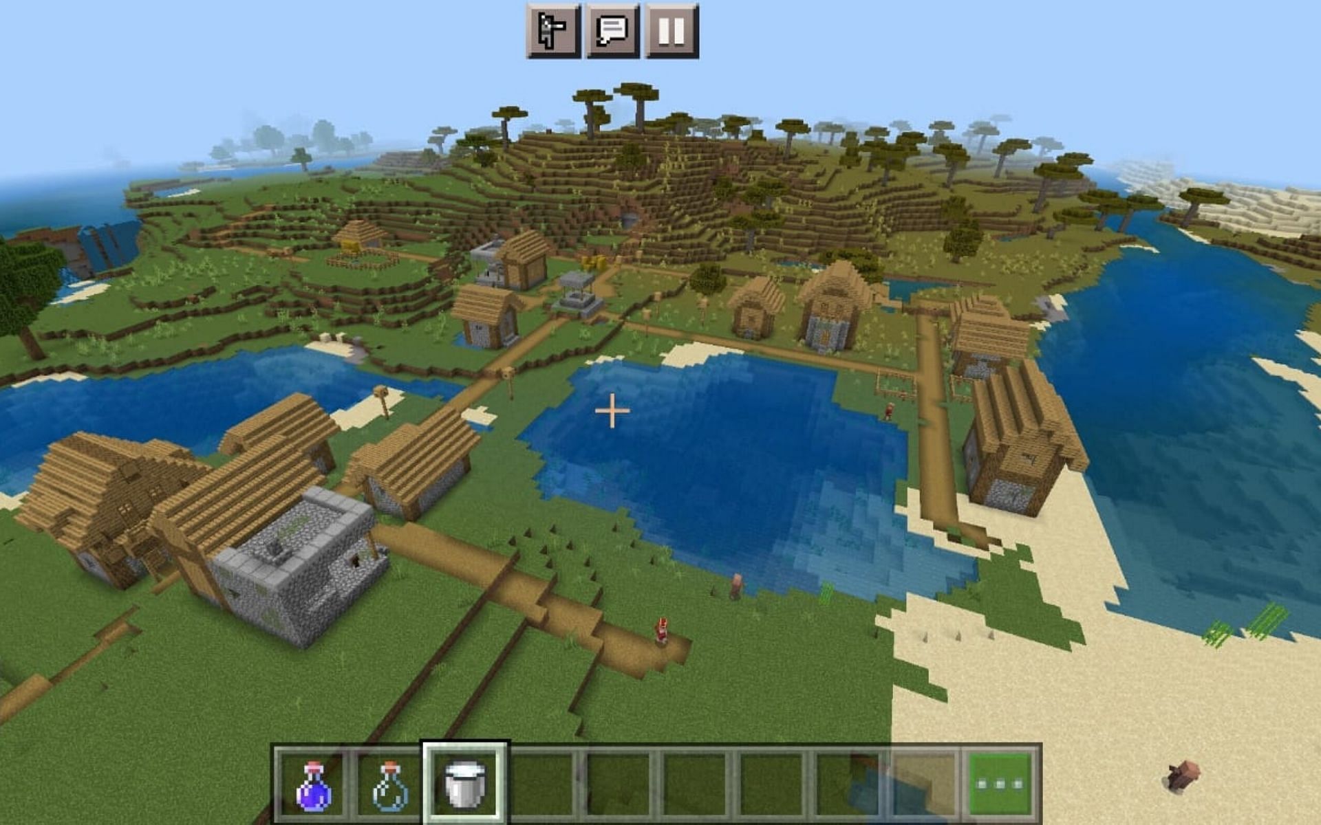 This seed spawns players on a lovely beach, with a village on the shoreline. This seed can also be used to perform a speedrun in Minecraft. Players can access two blacksmith chests located within the village to get decent loot and some iron at the beginning itself.