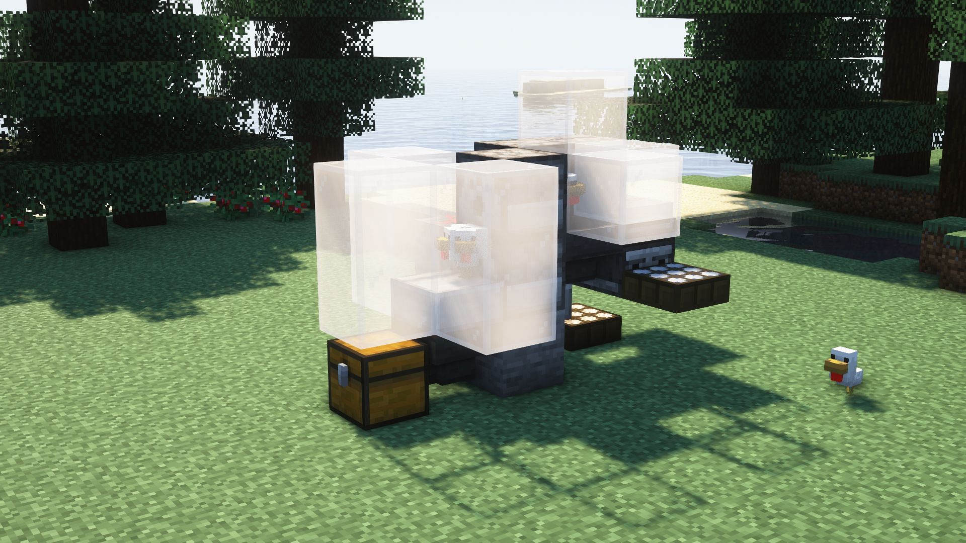 Using redstone items, players can create a simple chicken farm that kills mobs using lava. Doing so produces cooked chicken, which is then stored in the farm's chests.