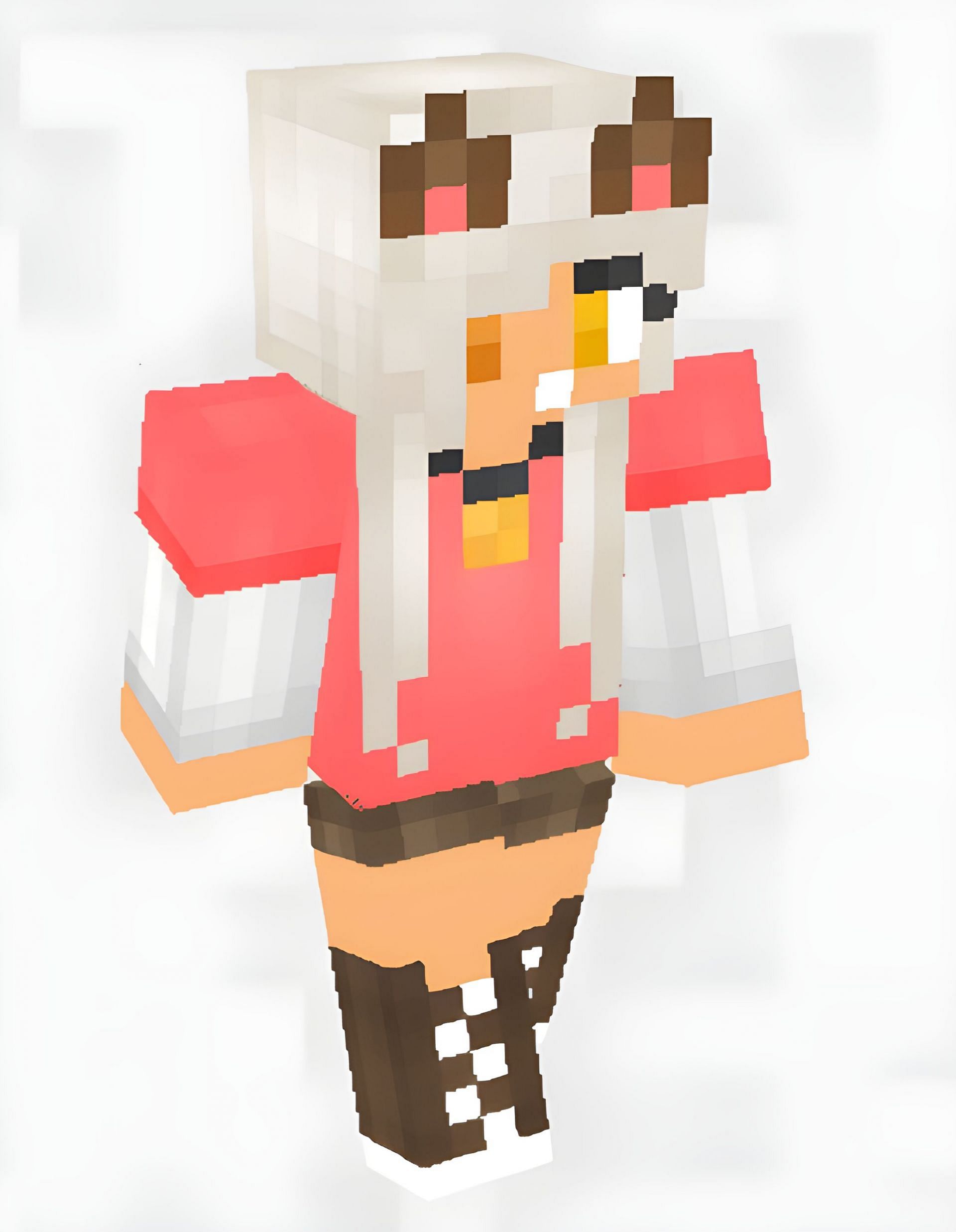This is a cute skin, very popular among girls because it is a girl skin with fantastic aesthetics. The contrast between the silver-blonde hair, pink shirt, and brown shorts/shoes makes this skin lovely.