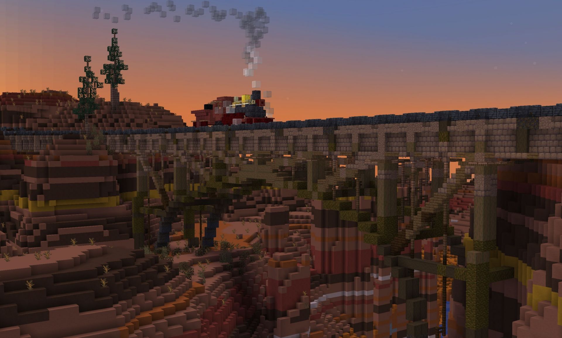 Using various wood types (including mangrove) as support structures, this mud brick bridge fits in perfectly with the dark tones of terracotta found in badlands biomes. Blackstone lines the top of the track's hoardings, adding a little contrast. Real-world mud bricks surely couldn't support the train of a locomotive, but this build shows it's more than possible in the confines of Minecraft.