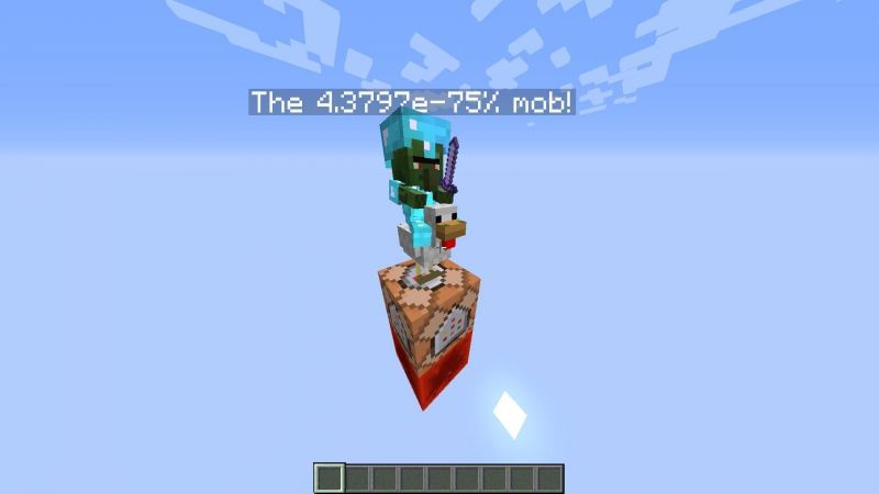 Coming across a baby zombie that is riding a chicken is rare. However, a player finding a leader zombie villager wearing fully enchanted diamond armor with an enchanted iron sword in its left hand and riding a chicken is the rarest.
