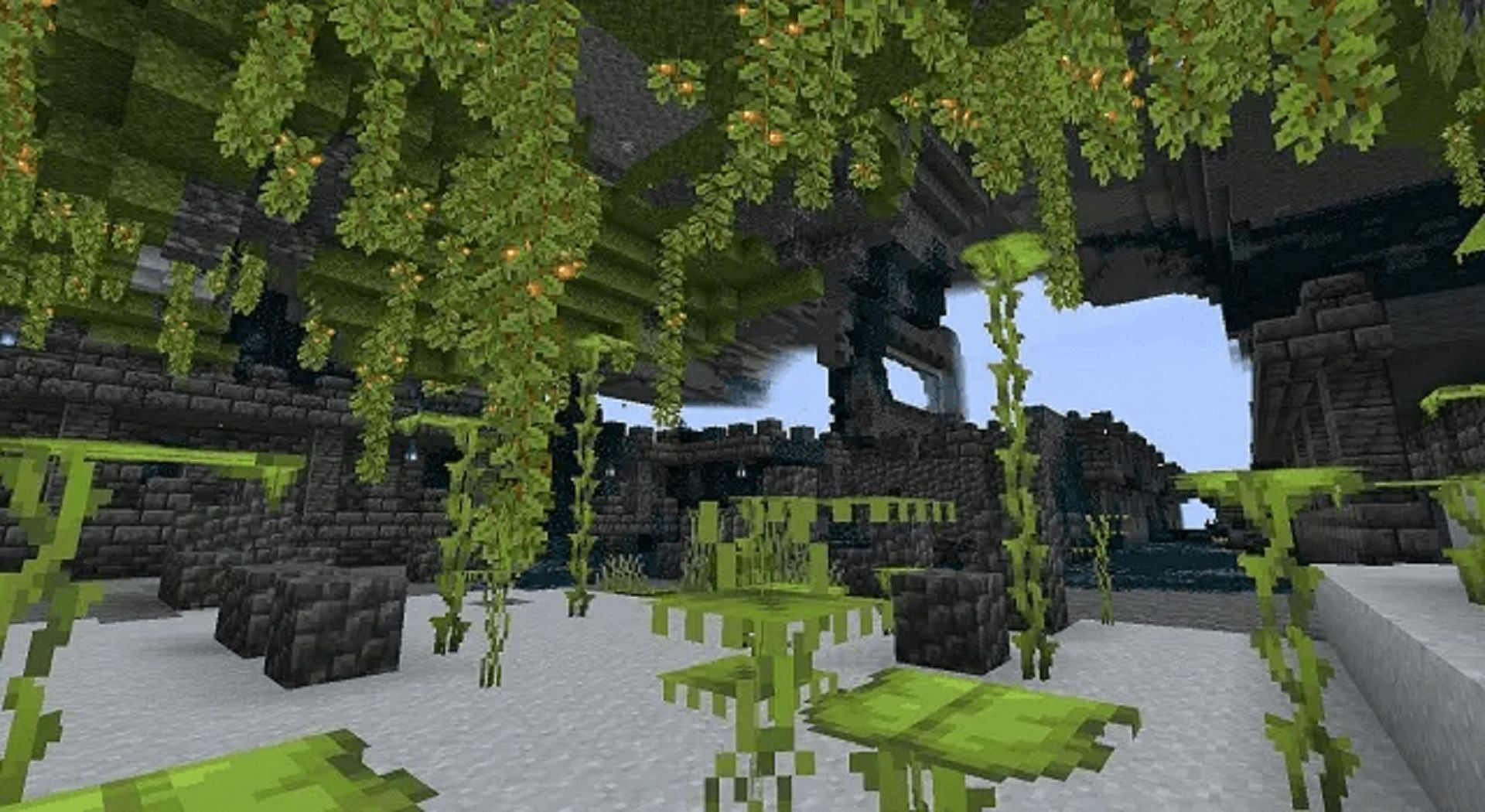 The strange feature of this seed is found at approximately (X: 2040, Y: -41, Z: -728). Here, players will find an ancient city mingling with the abundant plant life of a lush cave biome.