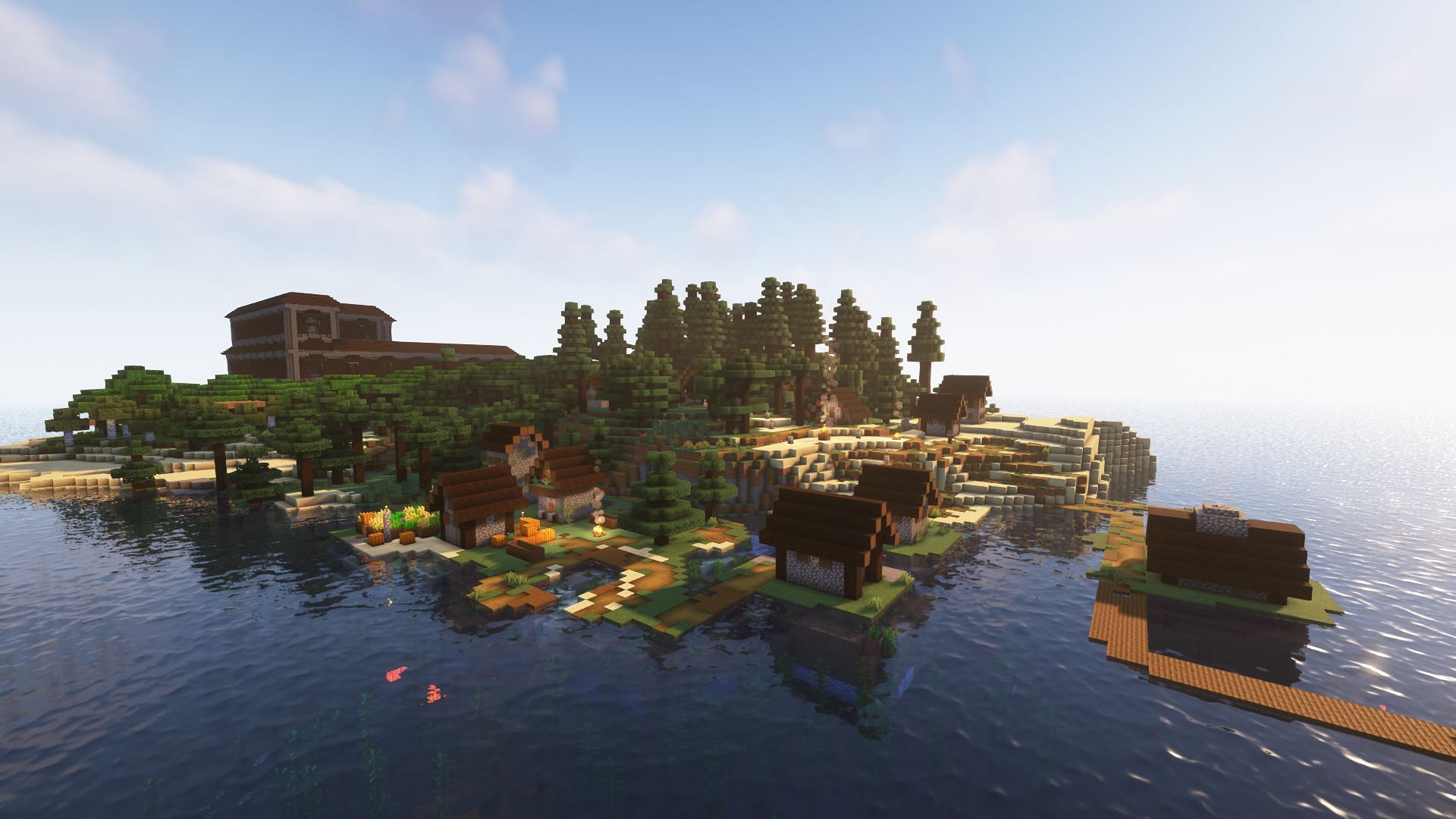 1) Taiga village and mansion at spawn island (Seed: -3420545464665791887)