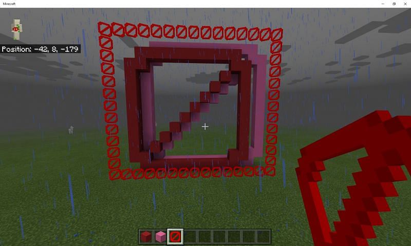 Once a barrier block has been placed, it will be visible to the player placing the barrier block until it is no longer selected in their inventory. As the player is placing blocks, they can see the block as a thick red square with a line going through the shape diagonally. This symbol will rotate within its block to maintain being visible to the player.