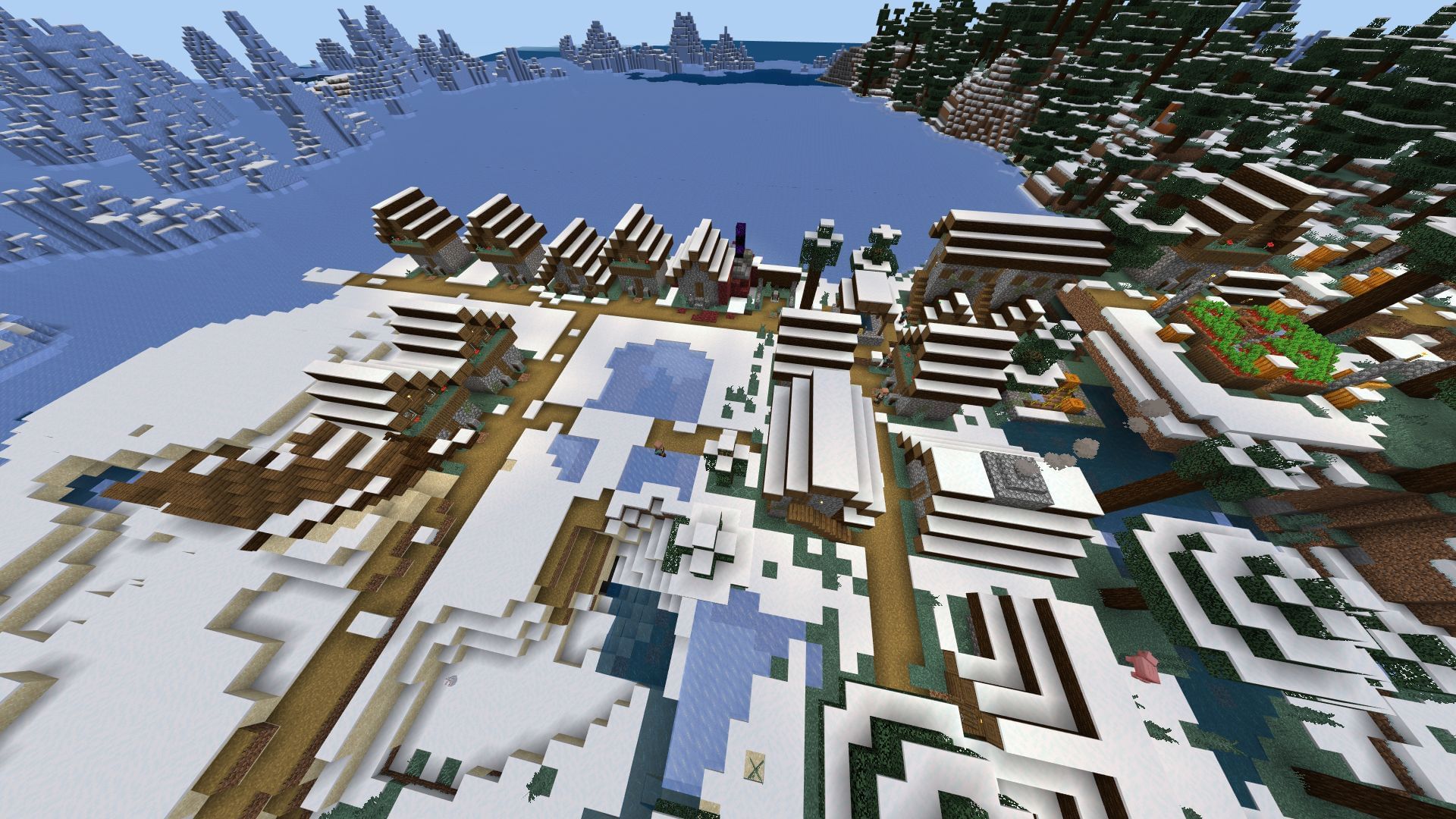 Players will spawn just a few steps away from a village complete with a blacksmith shop. The chest inside should contain more than a few diamonds, and the nearby mountain range may offer plenty of diamond ore to mine as well.
