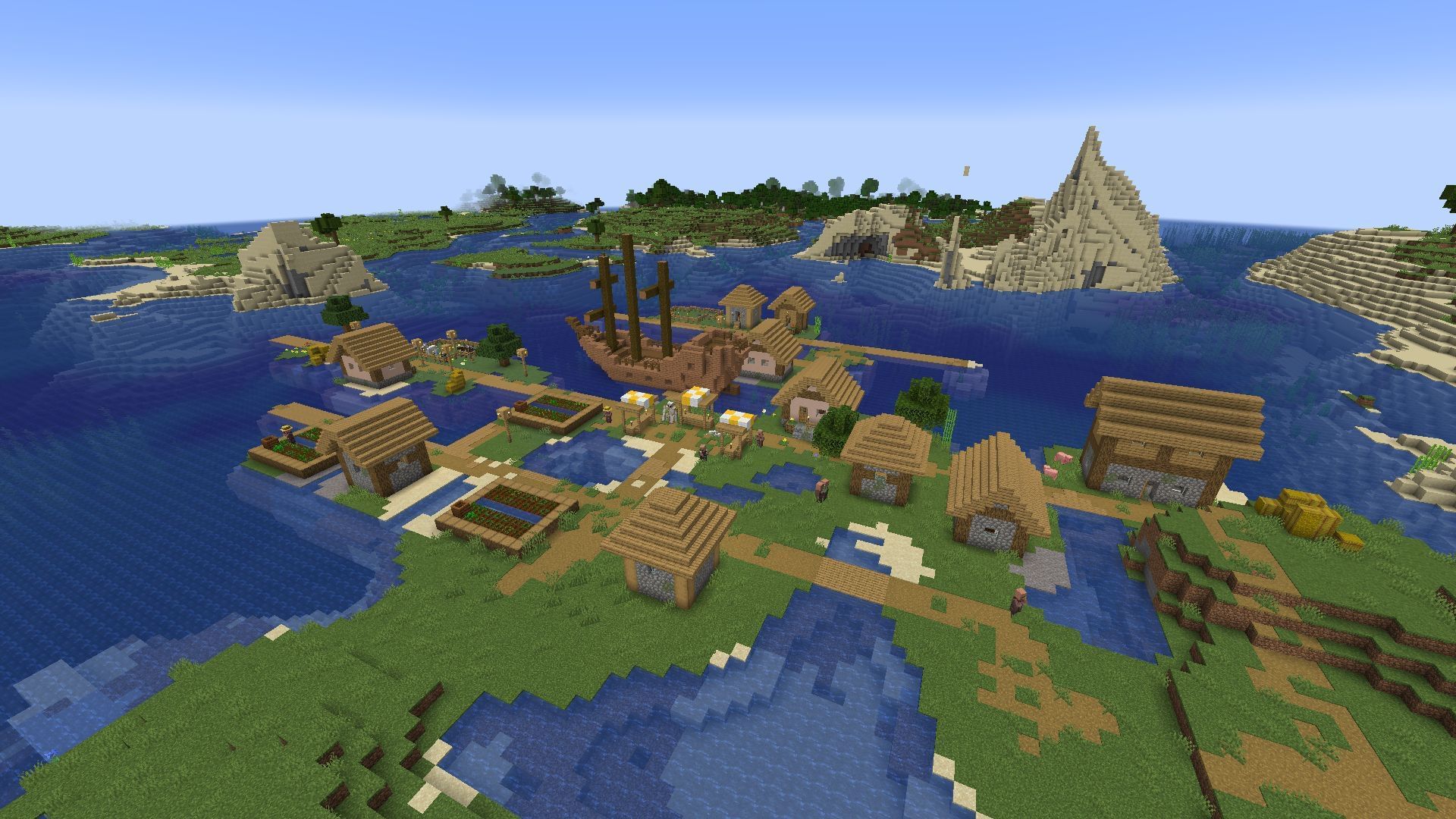 For a nice balanced spawn point with some extra loot thrown in, this Minecraft seed might be a great pick. Players drop right in front of a village that has a nice little amenity: an entire intact ship resting on its shores. The accompanying waters and small landmasses can also provide a few building opportunities if needed.