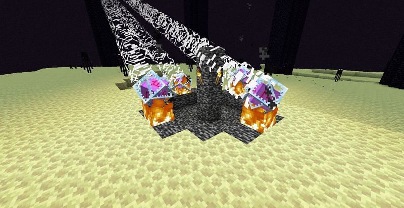 Visit the end realm and place four end crystals at the top of the bedrock on each side of the exit portal as shown in the image. After placing them, the ender dragon will start spawning. Use its magic attack to collect bottles of dragon's breath.