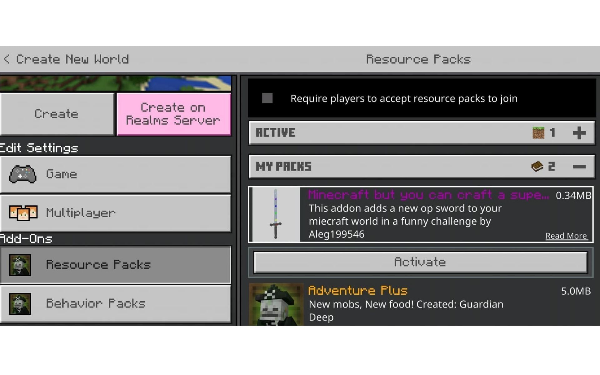 4) Tap on Activate. This will enable the mod in the world to be created.