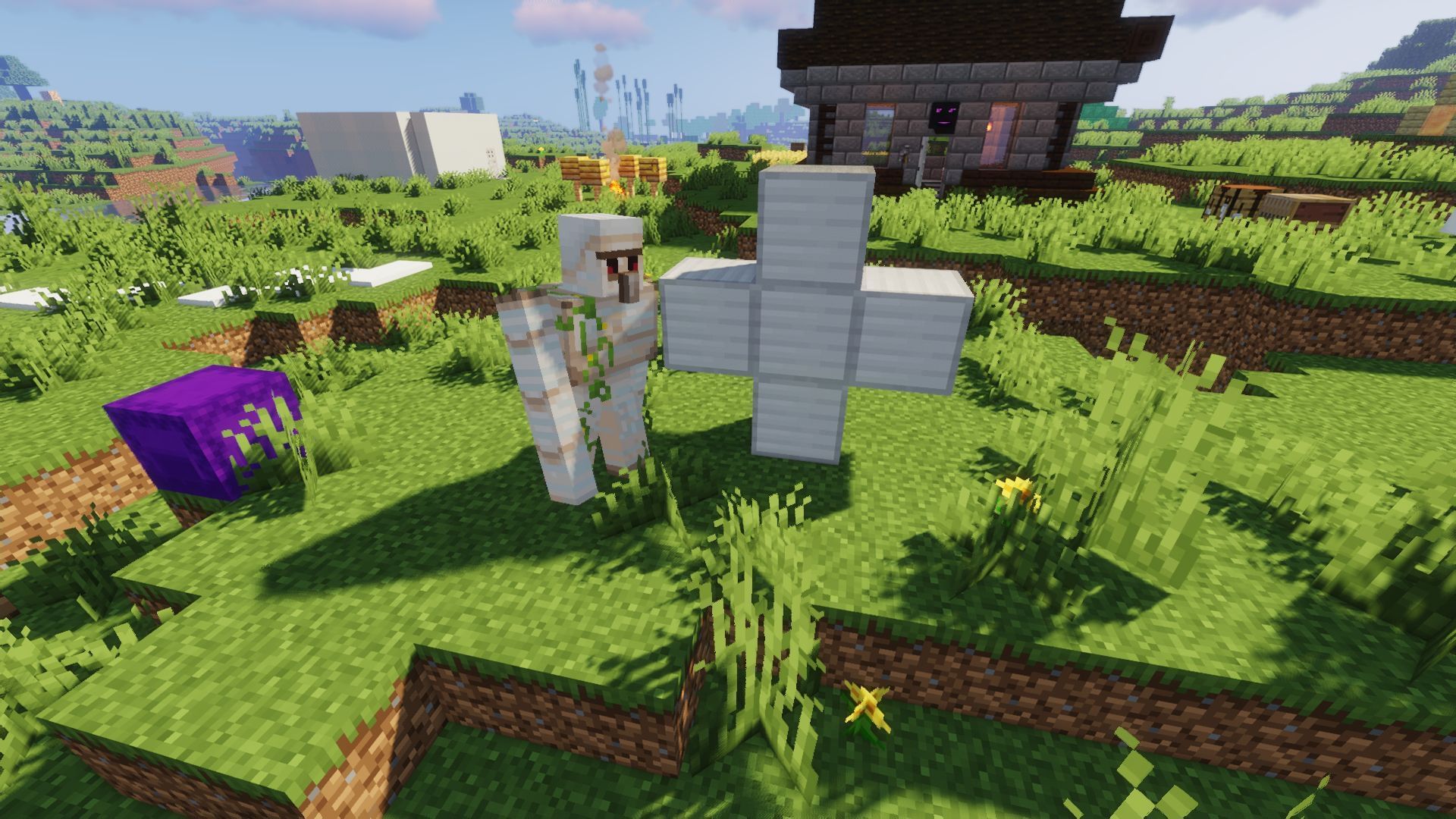 While they can passively spawn in villages, they can also be created. They can be constructed by building a capital ‘T’ of iron blocks before placing a carved pumpkin or jack o’ lantern on top of the center block of iron on the top of the T.