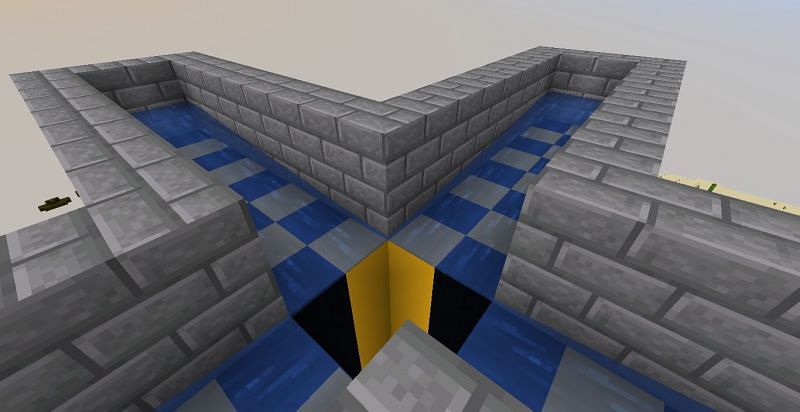 Now, make a two-block high wall around the water pathway. Once the wall is complete, place two water blocks on each side, as shown in the image. Make sure that the water is not falling.