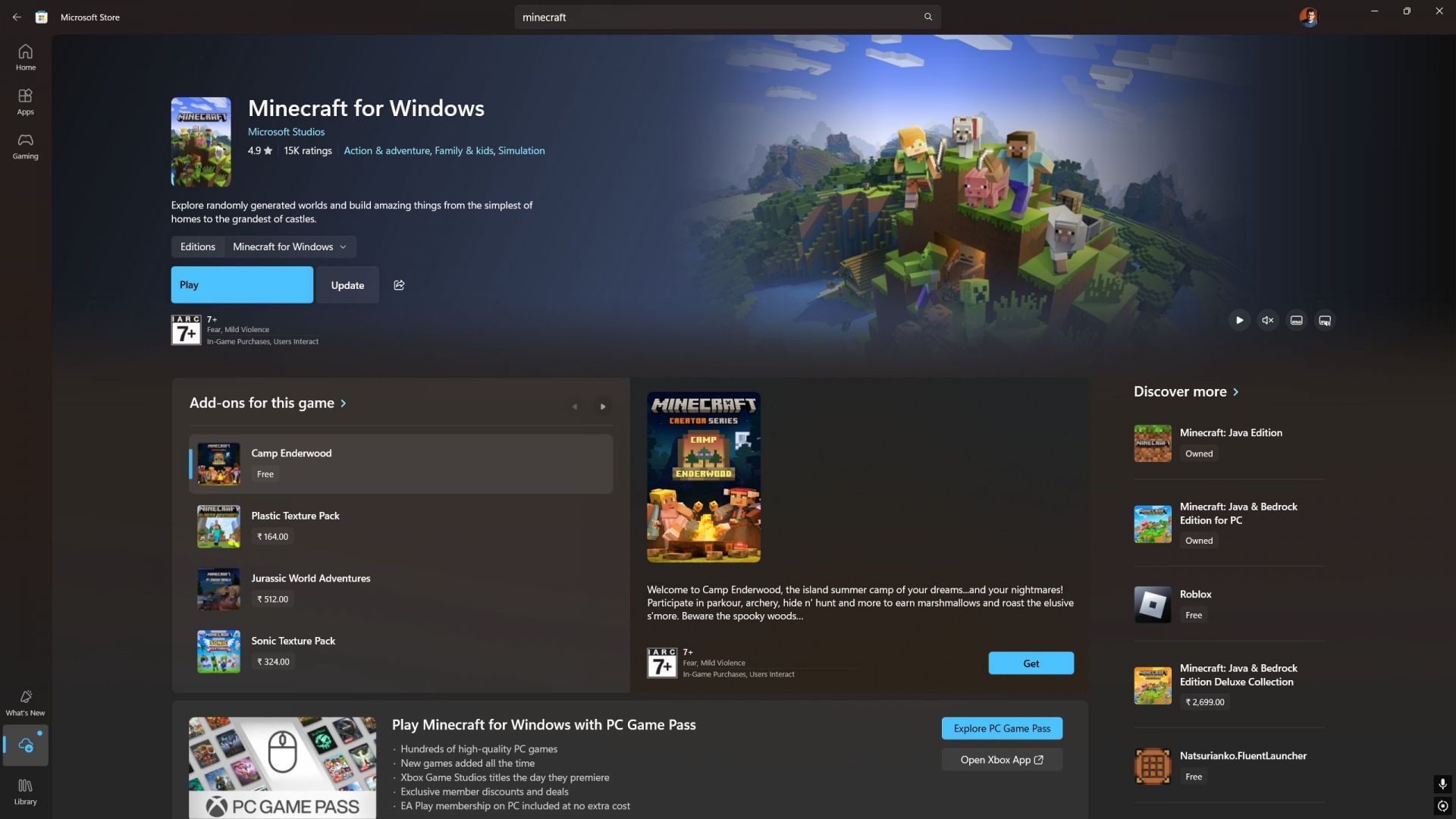 - Once the Minecraft page on your app opens, you'll notice the Open/Play button has been replaced by an "Update" button.