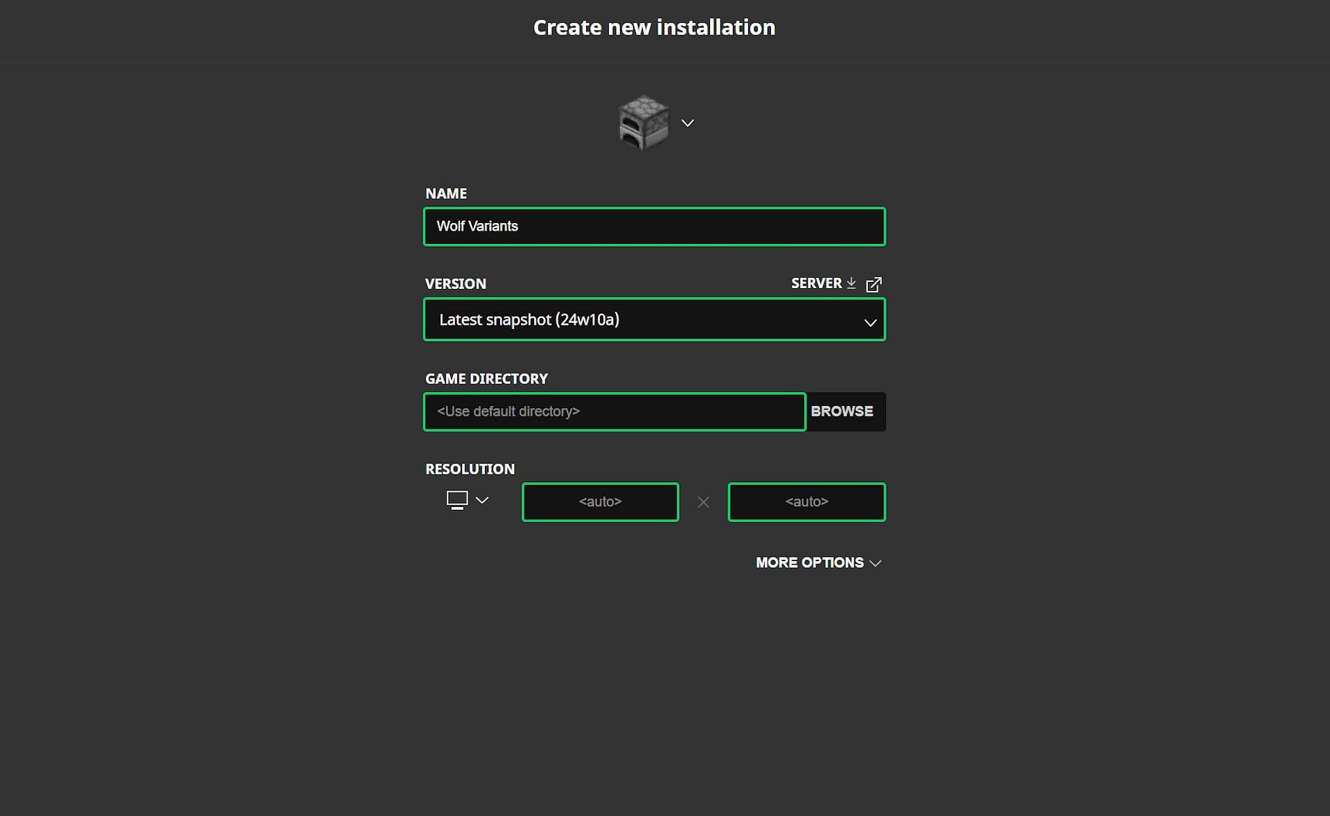 The name can be anything — just whatever helps you keep track of all the different installations you create. This example installation is using the name "Wolf Variants," as Minecraft's new wolf types are the snapshot's biggest addition. The second option is a drop-down menu of different game versions. All you need to do is open this menu, and the latest snapshot should be below the latest release.
