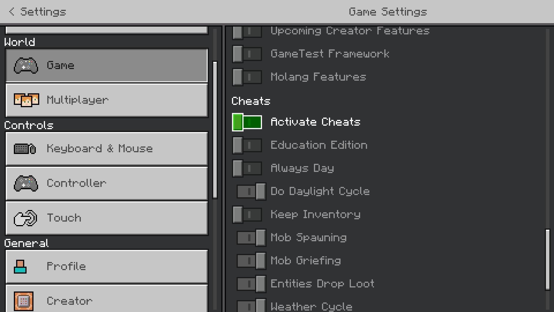 Activating cheats in Minecraft Bedrock Edition