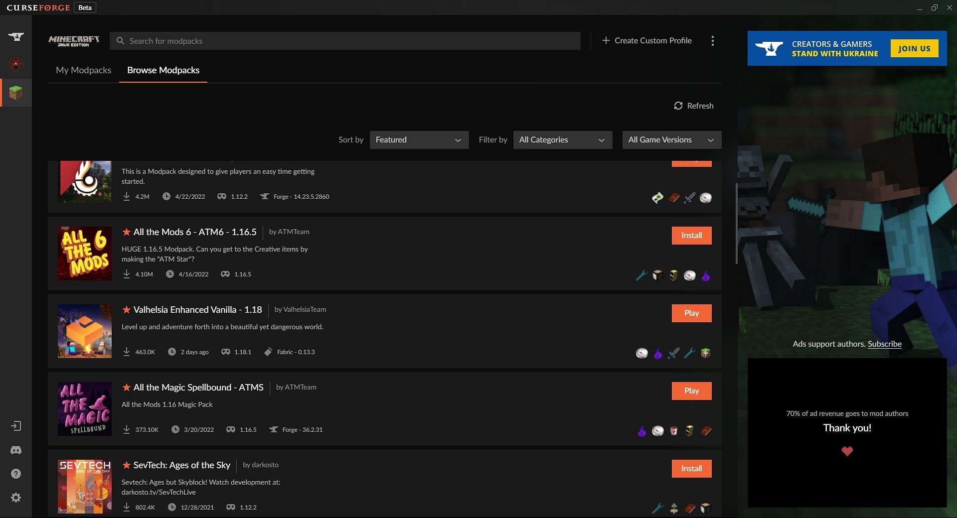 There will be no created profiles or installed modpacks when the program is first installed. Players will want to click on the “Browse Modpacks” tab underneath the logo for the game. This will showcase all of the most popular modpacks available for Minecraft. They can be sorted by feature by default, though this can be changed to sort by downloads or latest update, for example.