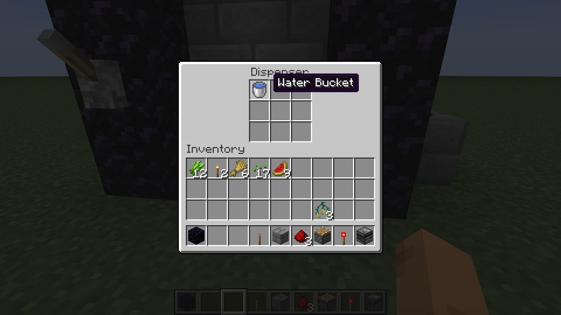 Now, load the dispensers with two specific items. Place the flint and steel on the left dispenser. On the right side, place your bucket of water.