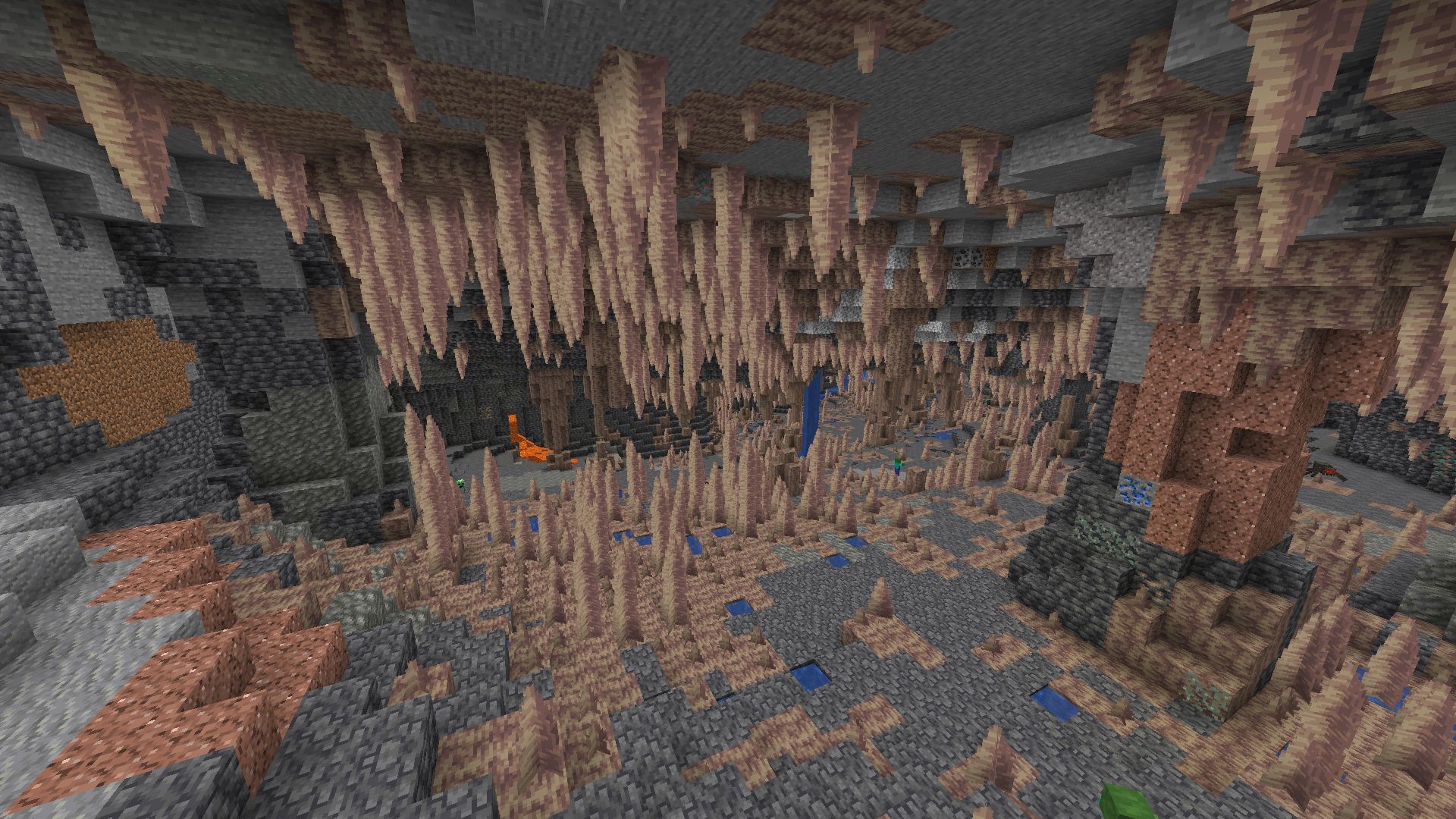 Dripstone and pointed dripstone blocks generate as stalactites and stalagmites from both the ceiling and floor inside this cave biome. Copper ores are generated in larger blobs in this cave biome as well.