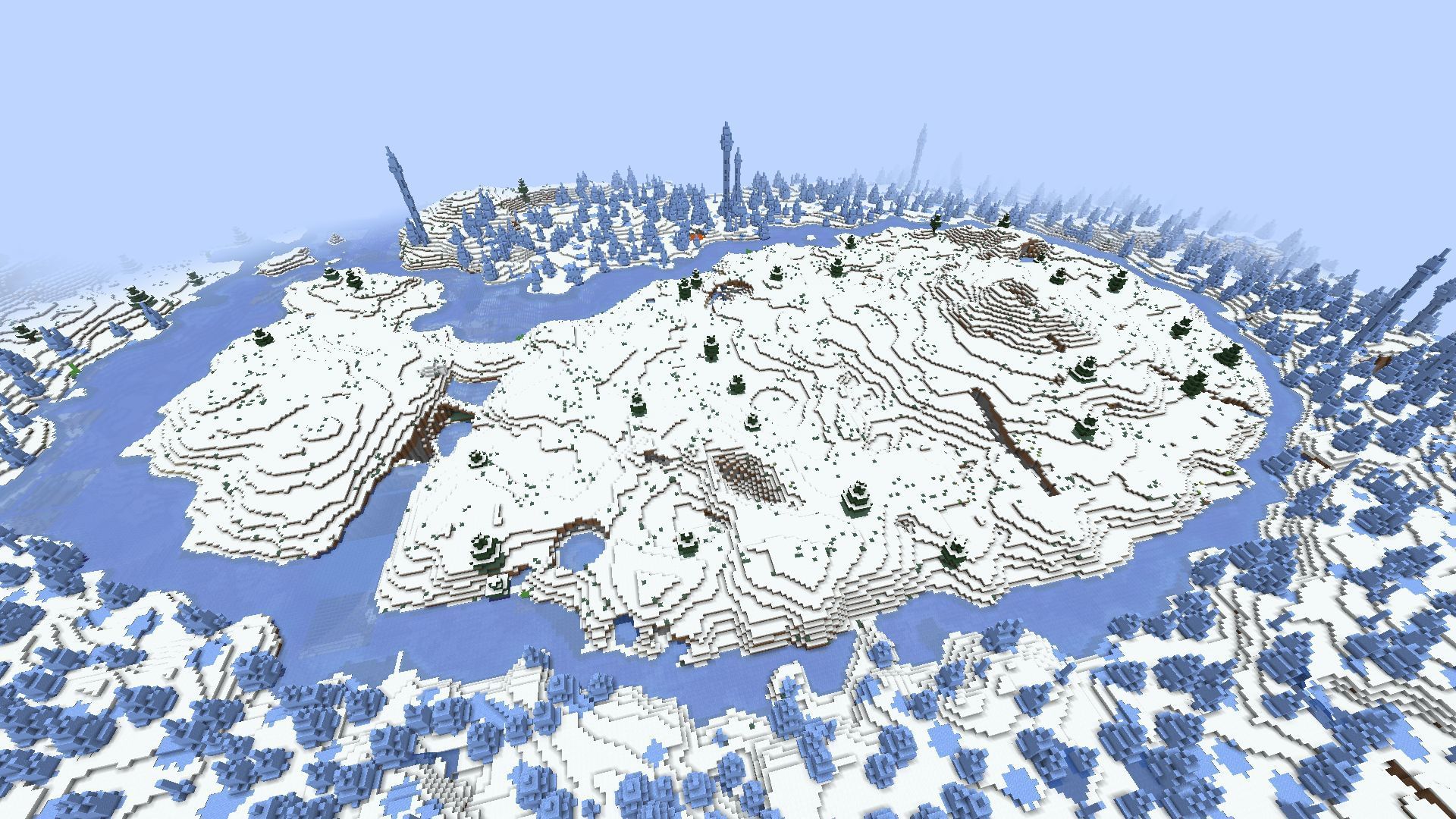 There is a large snowy plains biome surrounded by a frozen river, which is then ringed by a massive ice spikes biome. This would be the perfect seed to take a note from Frozen and create a wonderful ice castle among the cold spears.
