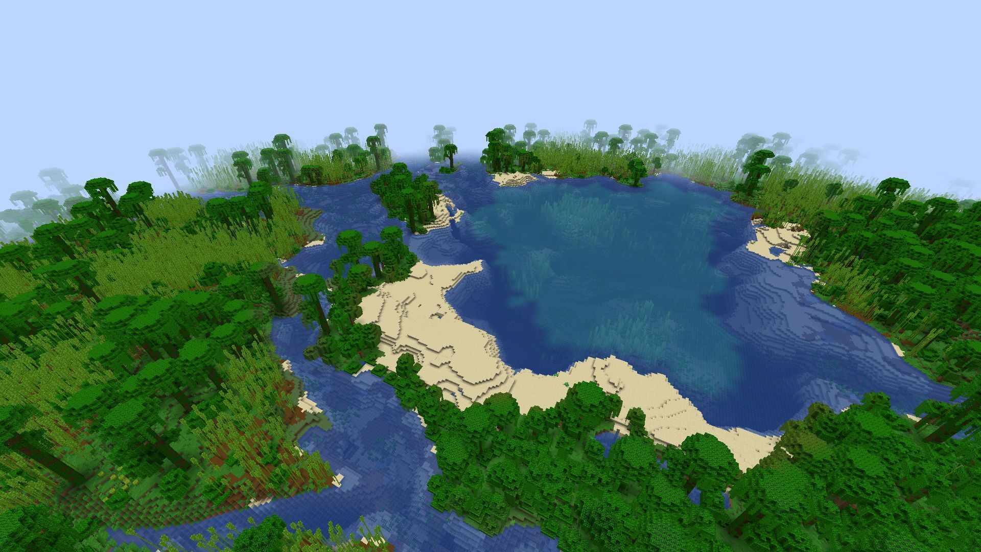 This seed spawns players in a massive jungle biome with a gigantic bay nearby. This cove is surrounded on three sides by a massive bamboo forest biome separated only by rivers that span at least a few hundred, if not more, blocks.
