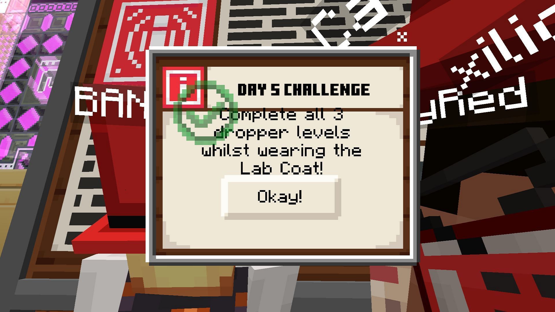 Log into Minecraft and join the Mojang Office Party event. Head to the Rewards Board in the main lobby to view your progress. By now, Days 1 through 4 should be marked complete with green check marks. Click on Day 5 to see your final task: Complete all three dropper levels while wearing the Lab Coat.