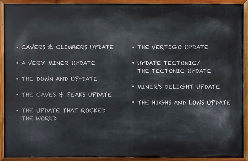 Potential names for what is now the Caves & Cliffs update were revealed by the hosts, M.A.R.I.L.L.A and narrator in the video. Some of the name ideas were: Caves & Climbers update, Vertigo update, Miner's Delight update, and Caves & Peaks update.