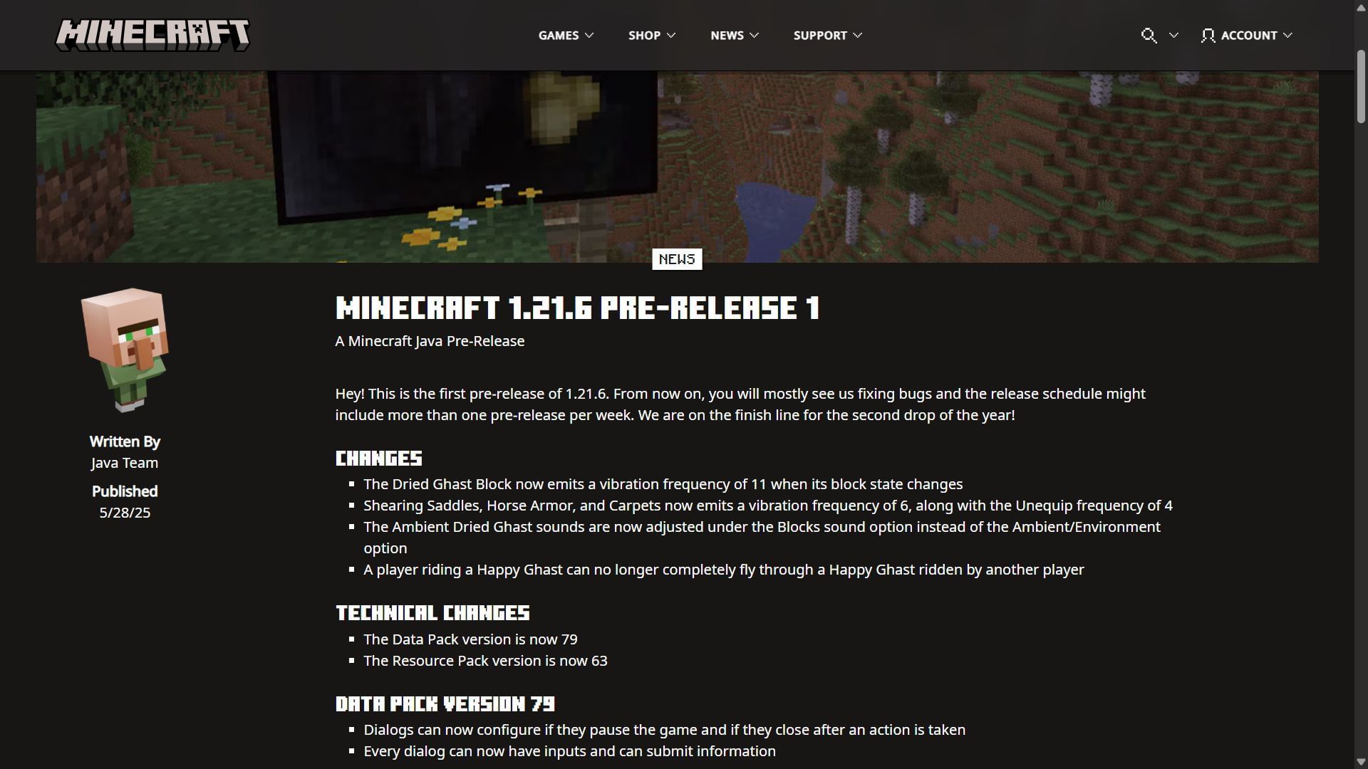 Mojang has released Minecraft 1.21.6 pre-release 1
