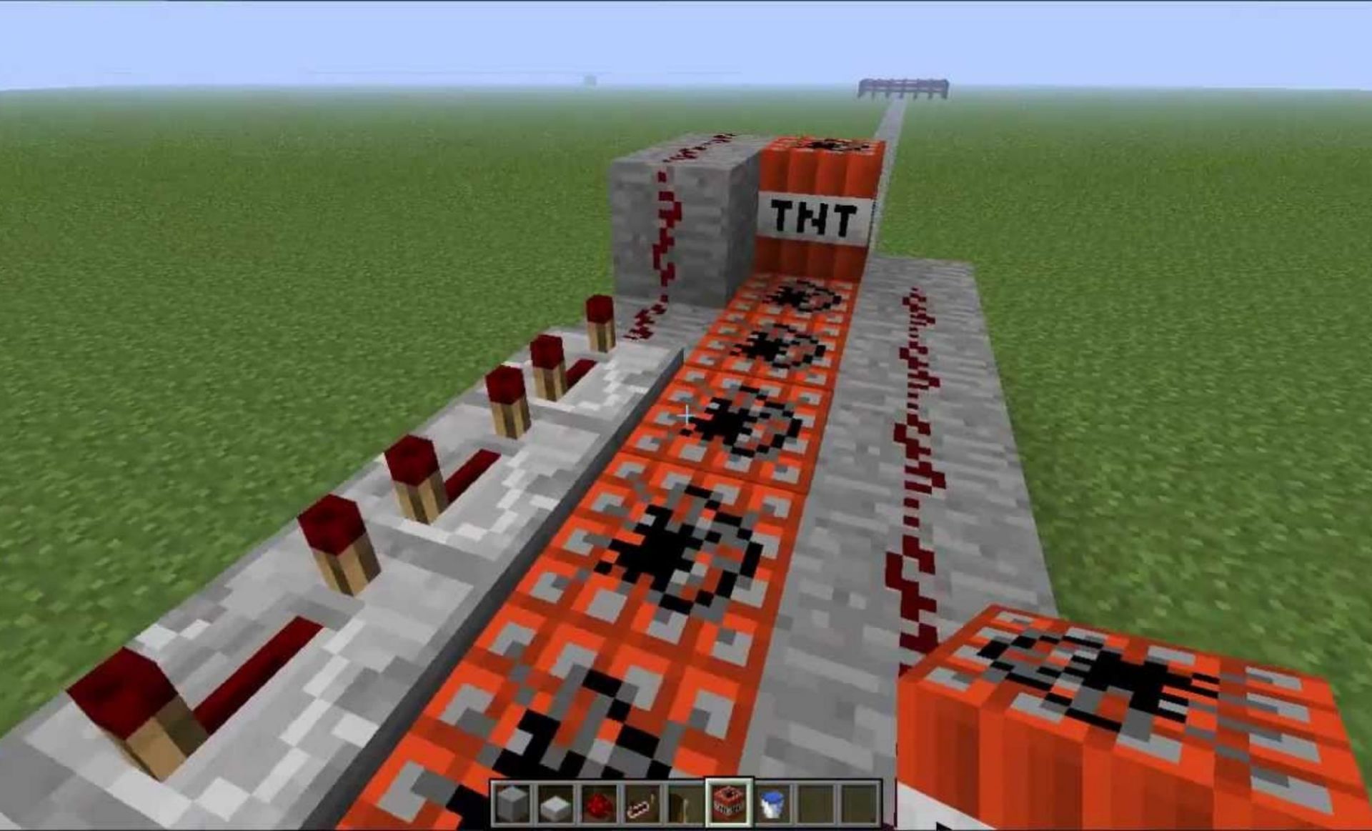 The gun here uses target blocks, which include redstone blocks, pistons, TNT and many other blocks. It ignites the TNT blocks and sends them careening towards the target in an instant.