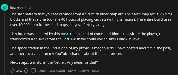 For those interested in the specifics of this build, the OP shares how it was created. They reveal that they used over 10,000 item frames and maps to create the space effects. Of course, this results in some lag.