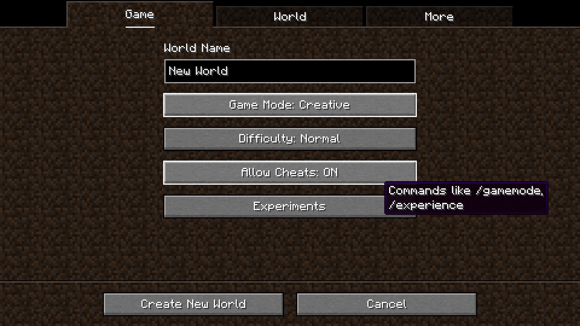 Next, you need to create a brand new world where you are in creative mode and cheats are enabled, since commands only work when the world cheats are enabled. Once this is done, you will be able to use the new command.