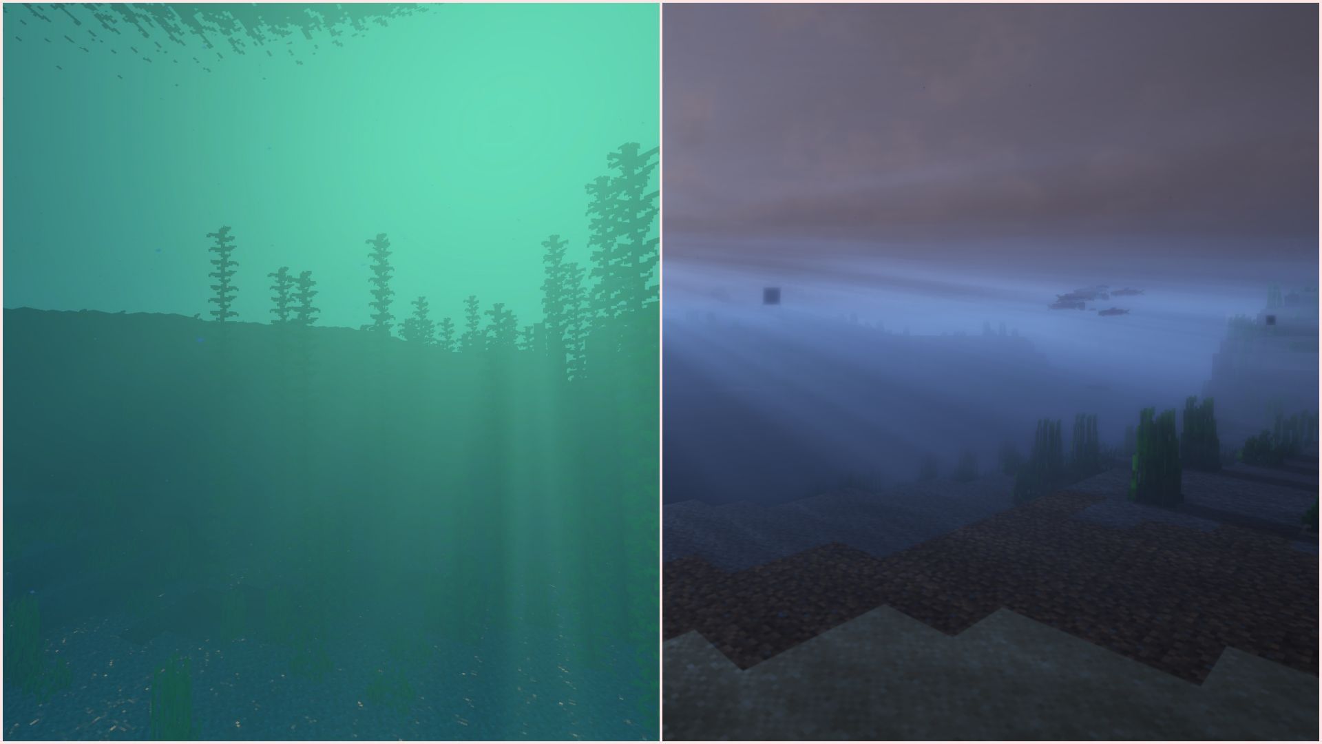 On the right side, more established Java Edition shaders have a much more natural and gradual underwater fog, which also allows players to see details on faraway blocks.