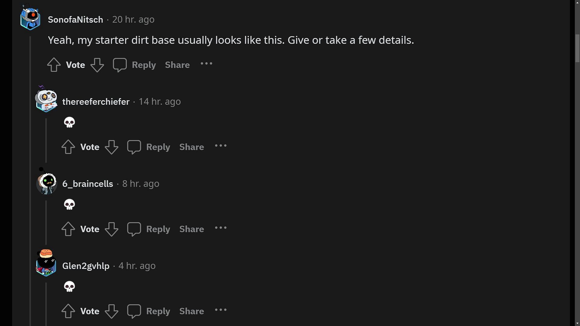 One of the Redditors sarcastically pointed out how their starter dirt base looks exactly the same whenever they create a new world. Several people replied with a skull emoji.