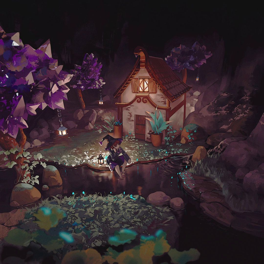 OP created a charming small house in the middle of a cave. In front of the house, OP created a small flowing river. Later, they also created trees made of newly added amethyst clusters to add a feeling of magic.