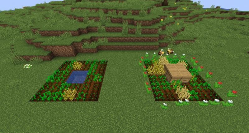 Minecraft players can place beehives in between their crops (seen above) to make sure that bees will be guaranteed to pollinate their crops.