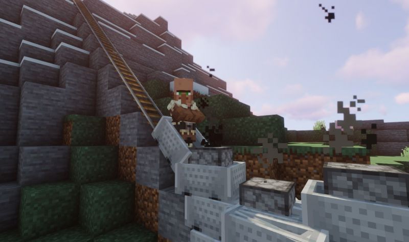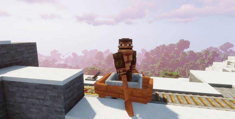 A villager will enter the cart when a player pushes it towards them. Before doing this, players will want to build the railway to the desired location for easy transport.