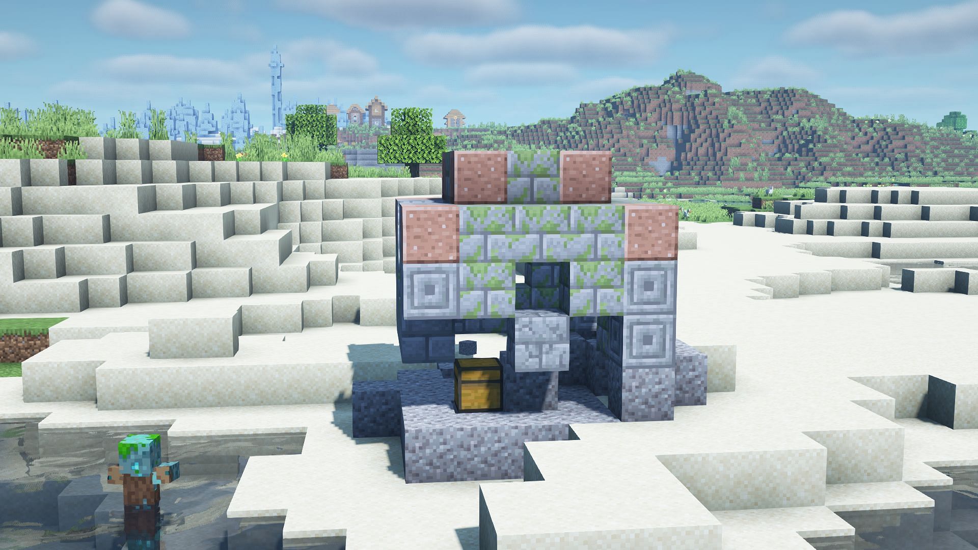 Finally, players will find an underwater ruin a few blocks south of the village. One of the ruins will be exposed, and therefore, players will be able to spot it easily. Underneath this portal, there is another mineshaft where players can find chest loot.